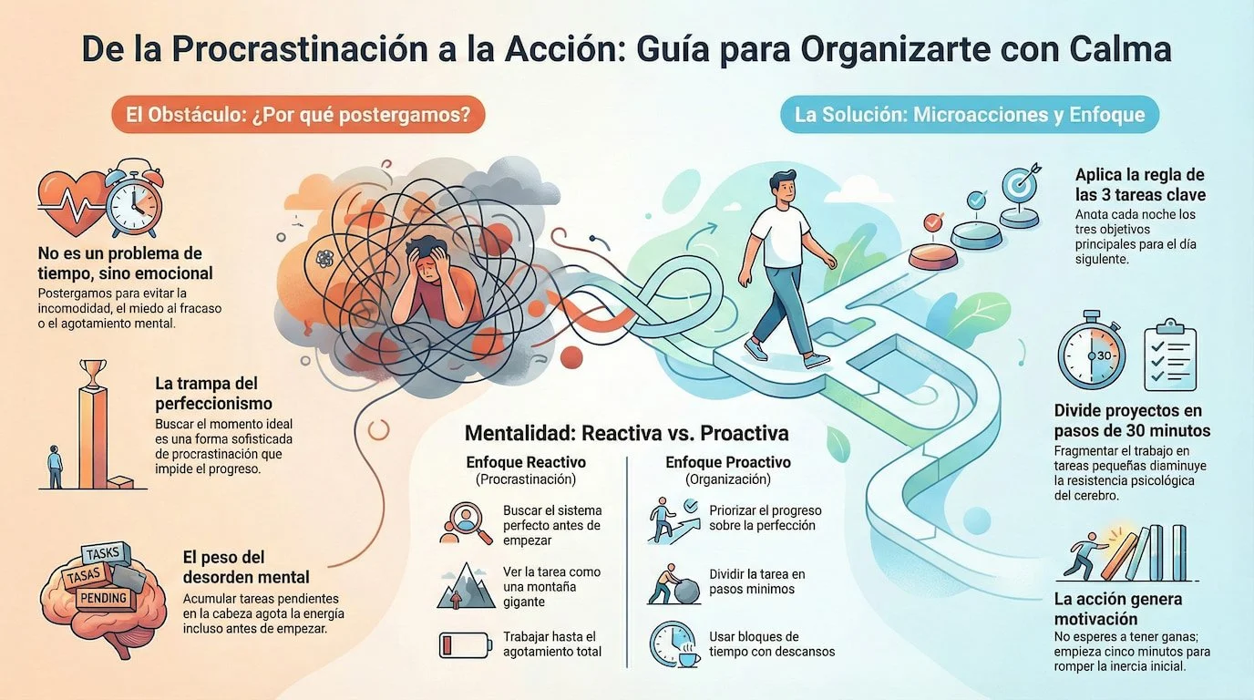 Hay días en los que sabes exactamente lo que tienes que hacer y, aun así, no lo haces. No es falta de inteligencia, ni de capacidad, ni siquiera de ganas profundas. Es esa resistencia silenciosa que te lleva a posponer lo importante mientras te entretienes con tareas menores. La procrastinación no siempre es pereza. Muchas veces es saturación, miedo o desorden mental.